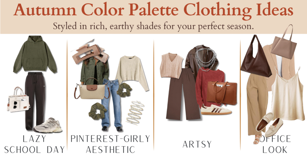 For Autumns who love to keep their style Instagram-worthy, these Autumn color palette clothing ideas bring cozy, feminine vibes in warm, earthy shades. Think soft cardigans, flowy skirts, and beige totes – the perfect mix of girly and aesthetic while staying true to your palette.